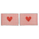 Two red felt love hearts "appliqued" with white blanket-stitch edges onto red and white gingham background. And white daisies on repeat on the reverse.