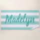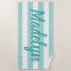 Personalised beach towel design features custom text in modern turquoise / teal blue script that can be personalised with a first or last name against a pattern of white stripes on a light aqua green blue background. Colours and font style can be completely customised.