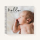 Journal and capture baby's first year with his personalised notebook. Customise the template to include a photo on the font and the back, have baby's name and a special message from you on the back. Modern typography script for the word "hello".
