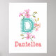 Personalised floral nursery name art poster print with flowers and name initial. Nursery art gift idea for child's room.