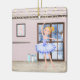 This beautiful pretty holiday Christmas ornament features a pretty blonde ballerina wearing a purple tutu. The ballerina is practicing in a pink and wood dance studio in front of a window displaying a beautiful winter snow scene. The dance studio features a balance bar, fairy lights, a picture of pointe shoes and water bottles. Personalise the back of this custom ornament with a name and year.