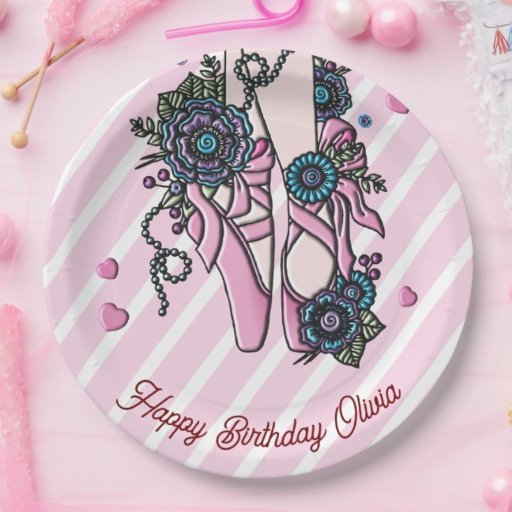 Pretty ballet shoes for your little ballerina accented with flowers and beads. A pink and white stripe background completes the ensemble. Can be personalised.