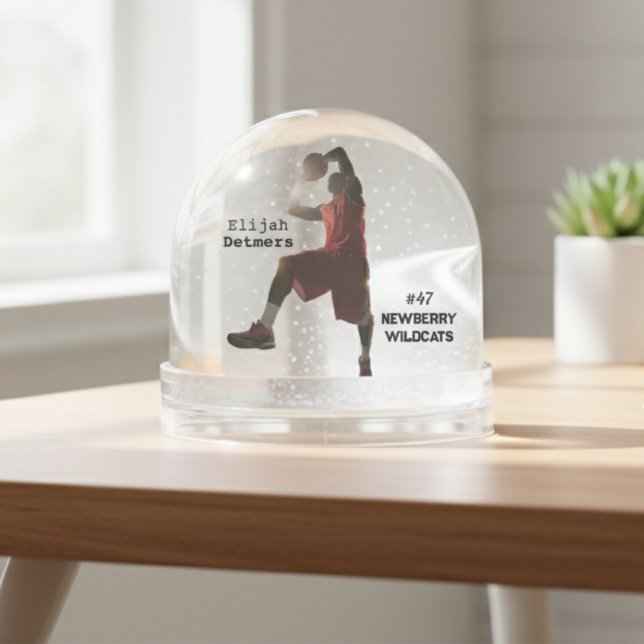 Celebrate your basketball superstar with our personalised basketball player snow globe! This unique keepsake features a dynamic basketball player in a red jersey, poised to make a shot. The snow globe is fully customisable, allowing you to add the player's name, jersey number, and team name, creating a truly special and memorable gift. Perfect for honouring a dedicated athlete, commemorating a great season, or as a proud display item for any basketball fan's home or office. It's an ideal gift for birthdays, end-of-season awards, holidays, or any occasion to cherish their time on the court.