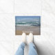 Personalised Beach House Ocean Door Mat features a tranquil photograph of the blue and white waves, blue skies and golden sand of coastal Melbourne, in Australia. Make your house a home and welcome visitors with this calming door mat. The text is in modern, white font which is customisable so you can add your own family name.