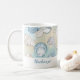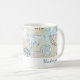 This personalised coastal themed mug features a pattern of hand drawn seashells in shades of blue and brown, with an aqua and sand coloured abstract background. If you would like this design on other products, please contact me through Zazzle Chat.