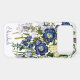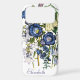 Old-fashioned botanical illustration of bellflowers in blue, purple and white.