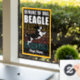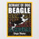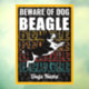Personalise this Beware of Dog window cling featuring an Beagle dog jumping in front of vintage coloured BEAGLE typography. Edit top BEWARE OF DOG text and edit DOGS NAME. Great Beagle dog sign for warning others.