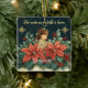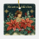 Add a meaningful touch to your holiday decor with our Personalised Biblical Nativity Child & Verse Ceramic Ornament. This exquisite ornament captures the heart of Christmas with a vintage-inspired nativity scene, featuring the phrase “For unto us a child is born” in an elegant font that highlights the season’s spiritual essence. Below, a young child in a light robe, crowned with a garland of holly and berries, stands peacefully surrounded by festive red poinsettias, holly leaves, and pine branches. The dark background, adorned with golden snowflakes and stars, adds a magical, wintery ambiance to this beautiful design.