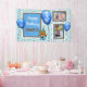 Blue Balloons light blue background, chocolate and blue cute bear cupcake and candy sprinkles background. Boy's birthday theme for a boy. Personalise this birthday banner by adding your baby's photo, age and name in the customise area.