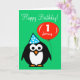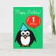 Personalised Birthday card | Penguin with party hat and red balloon. Cute cartoon design with custom age number. Baby 1st for example. One year old boy or girl.
