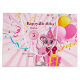 Wearing a Birthday hat, holding birthday balloons and a gift with confetti background, and pink shiny rays.