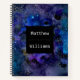 Personalise the text with your name, monogram, or saying. The black text box is on a black, blue, and purple galaxy and stars background. Available in a variety of notebook paper styles.