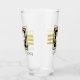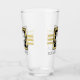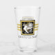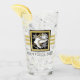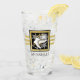 The design features a pair of ice skates over a snowflake crest with black and faux gold glitter background. This elegant winter sports design serves as a cool modern and unique glass tumbler with personalised text.