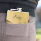The flask itself is fine. It’s a cheap flask, obviously bought in bulk, however am prepared to overlook that. Given that it is a personalized item, I would have liked to have seen gift boxing instead of the generic packaging. Terrible printing, and/or quality. It’s a cheap, tacky vinyl. It is not cut straight and is also applied in a way that it is overhanging the bottom, causing the glue to catch on items and it will eventually roll and tear, damaging the wrap.