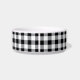 This unique custom pet dog or cat bowl features their name personalised in classic all-caps serif text with a rustic farmhouse buffalo plaid check patterned background in black and white colours. A stylish water and food bowl for your furry family member, available in medium and large sizes.
