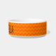Funny, cute, modern, personalised, kawaii black cat pet bowl with name and orange chevron pattern.