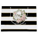 Modern design, bold black and white wide striped pattern with small faux gold glitter edging and a hand painted floral wreath made of white and blush pink roses with vining branches and pink and white hydrangeas. A few lavender Freesias are also tucked in along with succulent leaf foliage clusters. A typography text message reads "So Happy for you two!" and the bride and groom's names are personalised below. Art copyright Audrey Jeanne Roberts all rights reserved.