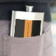 Classic masculine flask with two thin white stripes and a wide vertical orange stripe on the centre with custom name on it.