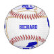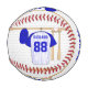 Personalised blue and white baseball jersey hanging in a sports locker room with a baseball cap, baseball bats and ball which is fully customisable with your own name and number. Great gift for any baseball, t-ball or softball player or fan.