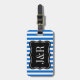 Personalised blue and white striped luggage tag. Elegant style. Classy royal blue stripe design with white monogrammed name intitial letters of couple. Great gift idea for husband and wife, married couples and newly weds going on honeymoon. Cute 3 letter monogram with striped pattern. Customisable background colour.