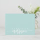 A chic personalised stationery flat note card featuring your name in a white brush script with decorative swashes on a blue green background. Modern simple elegance.