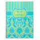 This monogrammed turquoise blue, green, and white stripes with damask notebook has template boxes for you to add your name, initials, monogram, or other text. If you need help customising this item, please email niteowlstudio@gmail.com for assistance.