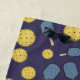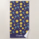 This pickleball beach towel design is complete with a seamless pattern of pickleballs and pickleball paddles set against a dark blue background. There is a place to add your name at the bottom of the towel.