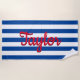 This beach towel features blue and white stripes. Personalise this beach towel with your name or text of your choosing which appears in large red font across the length of the towel.