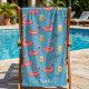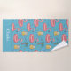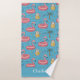 This summer-themed bath towel design is complete with a seamless pattern of flamingo pool floaties, pitchers of lemonade, sunglasses, and palm trees set against a blue background. There is a place to add your name at the bottom of the towel.