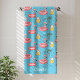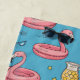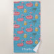 This summer-themed beach towel design is complete with a seamless pattern of flamingo pool floaties, pitchers of lemonade, sunglasses, and palm trees set against a blue background. There is a place to add your name at the bottom of the towel.