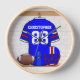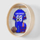 A personalised American football grid iron jersey in blue with white and red stripes, hanging in a sports changing room with a football helmet, a water bottle and a football. The jersey can be fully personalised with the number and name of your choice to make a great gift for any football fan, grid iron player or football coach.