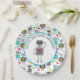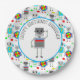 Robot themed personalised birthday party paper plates. Colours: blue, yellow, lime green and red.