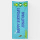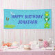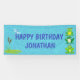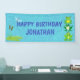 Personalised Boys Frogs Birthday Banner.This design has 3 cute frogs, a dragonfly, lily pad, and cattail.The background is a water pattern. Great birthday decor for a Frog themed birthday party.