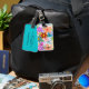 Bright and colourful design featuring flowers, butterflies, and leaves with orange, pink, purple, blue, and yellow colours. Customise the front with your name or monogram letter and add your contact details on the back. Great as a gift.