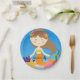 Personalised Brunette Mermaid Birthday paper plates features a pretty mermaid with brown hair decorated with colourful starfish, orange mermaid tail, starfish, sea weed, blue ocean, and an area you can personalise with the birthday girl's name and age!