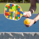 You'll be all the rage on the pickleball court when you're sporting one of these brightly coloured personalised pickleball paddles with a building blocks pattern with pieces in blue, yellow, green, orange, red, and blue. There is a white band across the centre with green trim inside another band of yellow and red that is personalised with your name in blue. There is a neon green pickleball placed on top of the band on the right side with the name to the left of it. The backside has only the band on it with customisable text that says, "Dink Responsibly" on it, which is a play on words of "drink responsibly". Email niteowlstudio@gmail.com with any request for changes.