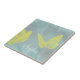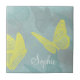 A pretty yellow butterfly pattern over a blue-grey grunge watercolor foliage background. Personalised with your name in trendy white script.