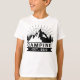 Personalised Camping Kid's T-Shirt - Travel and the great outdoors can have an amazing effect on the young. Celebrate these magic days with this awesome camping t shirt design. Featuring mountains and trees over a sunburst with the phrase "Camping". Under the illustration is a black banner. The wording can be customised to anything you wish. Our suggestion is your little camper's year of birth. The ideal shirt for your family holiday.