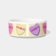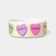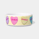 This Valentine's Day show your dog or cat how much you love them all month long or all year long. Nostalgic candy hearts in pastel pink, green, purple, yellow, and blue circle this pet bowl and each heart is customised with your pet's name. A very cute personalised design for your pet. Light yellow background.