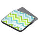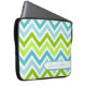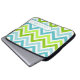 Stylish zippered laptop bag done in a colourful turquoise, aquamarine, moss green, light green, and white chevron zigzag pattern. A white band, on the bottom, has turquoise text ready to personalise for yourself or as a great gift idea.