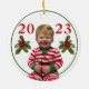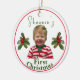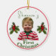 This is a Christmas-themed ornament with room for photos on both sides, as well as your child's name, the Christmas you are celebrating (their first, second, etc.), and the year. The traditional red and green design also features holly artwork on each side. Message MineByDesign for help with custom designs!