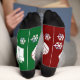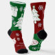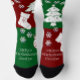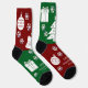 Christmas socks featuring a whimsical red and green design. The socks are adorned with artwork of Christmas trees, stockings, ornaments and gifts. The art is surrounded by snowflakes, with room for names or a custom message on each sock! Message MineByDesign for help with this design or any other design you envision!