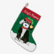 Cute Personalised Black and White Cartoon Bernedoodle Puppy wearing "Tis The Season" Elf hat and red collar. Snowy background. Cute bernadoodle christmas stocking!