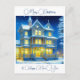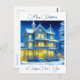 Seasonal winter house illuminated on a snowy night personalised Christmas postcard.