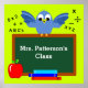 Customise this personalised classroom poster of a happy bluebird cartoon perched chalkboard with teacher's name and apple and books in foreground. Will brighten up any elementary school class. Background colour can be changed too.