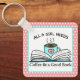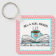 Add your name to this Pink and teal coffee, a good book and polka dots cute quote key chain.