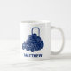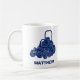 This personalised coffee mug is perfect for landscapers. It features an illustration in navy blue of a commercial grade ride-on lawn mower with your name other message below in coordinating navy blue.