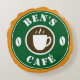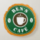 Personalised coffee shop decoration pillow. Round coffee bean and cup design. Personalise with company, employee name, barista name or cafe / bar company name. Green and brown colours. Trendy home decor for coffee shop lounge. Orange or custom background colour.