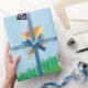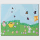 A cute colourful Easter illustration depicting an Easter egg hunt with a bunny rabbit and a chick. A beautiful Spring scene with butterflies, ladybugs, kite flying and lots of pastel patterned Easter eggs over green rolling hills and grass. An ideal design for Easter gifts and Easter Spring decor.
