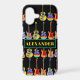 Let your guitar player teen rock out in style with this personalised guitar phone case featuring a bold psychedelic pattern of electric, acoustic, and semi-acoustic guitars in vibrant shades of blue, orange, yellow, purple, green, and red on a sleek black background.